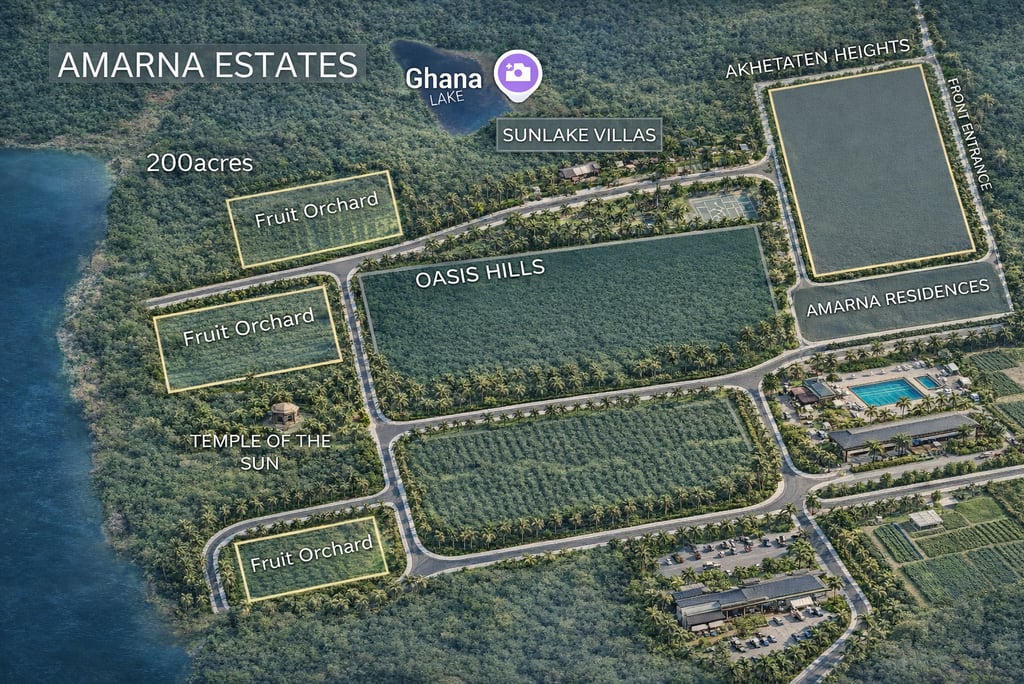 Situated on a breathtaking 200-acre elevated plateau in Ghana’s Volta Region, New Las Vegas Amarna Estate is a master-planned gated community that fuses eco-luxury living, digital real estate innovation (NFTs), and sustainable development. Bordered by the serene River Dayi on one side and featuring its own private lake, this visionary development offers a rare blend of tranquility, opportunity, and futuristic living.
